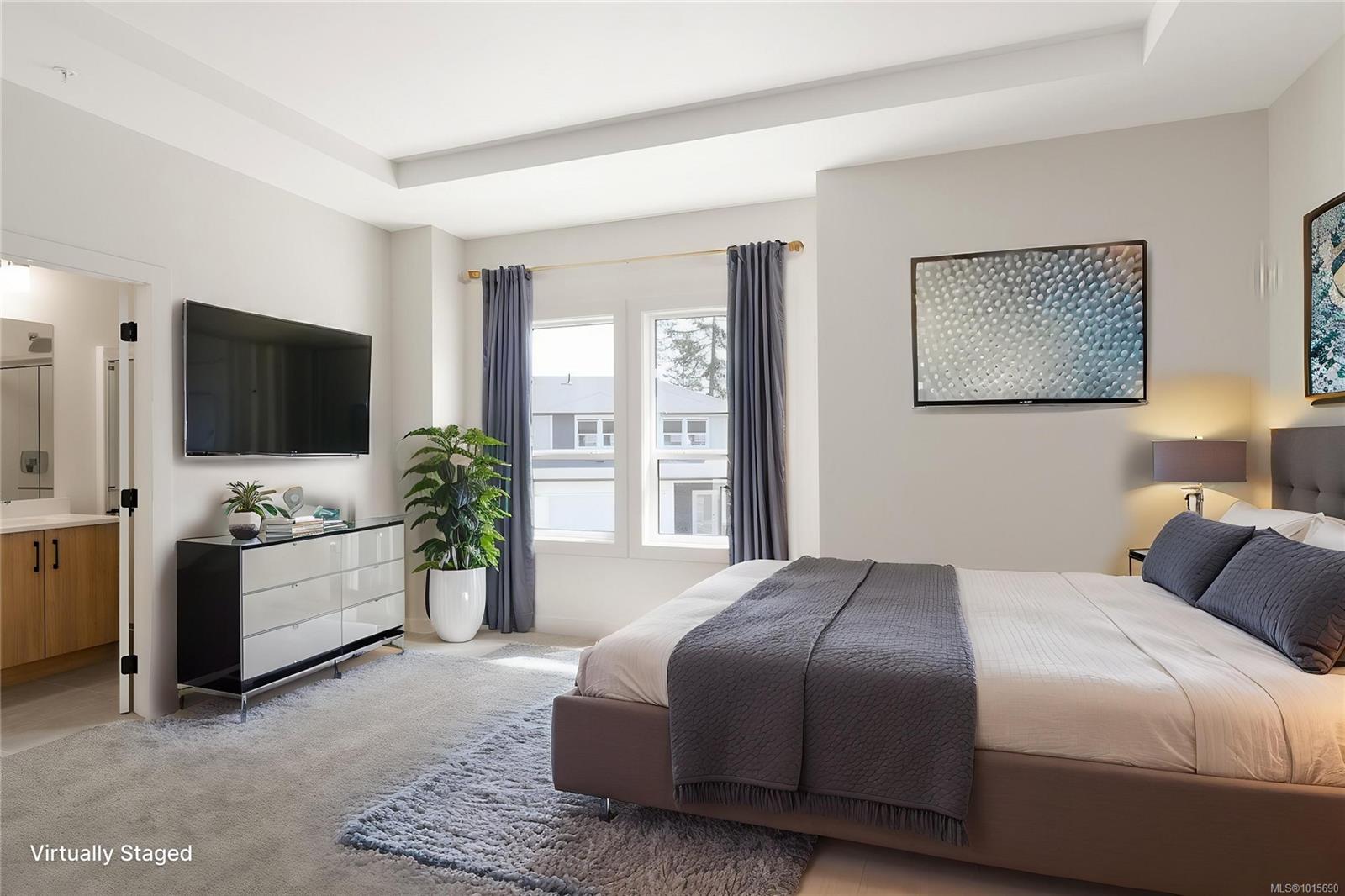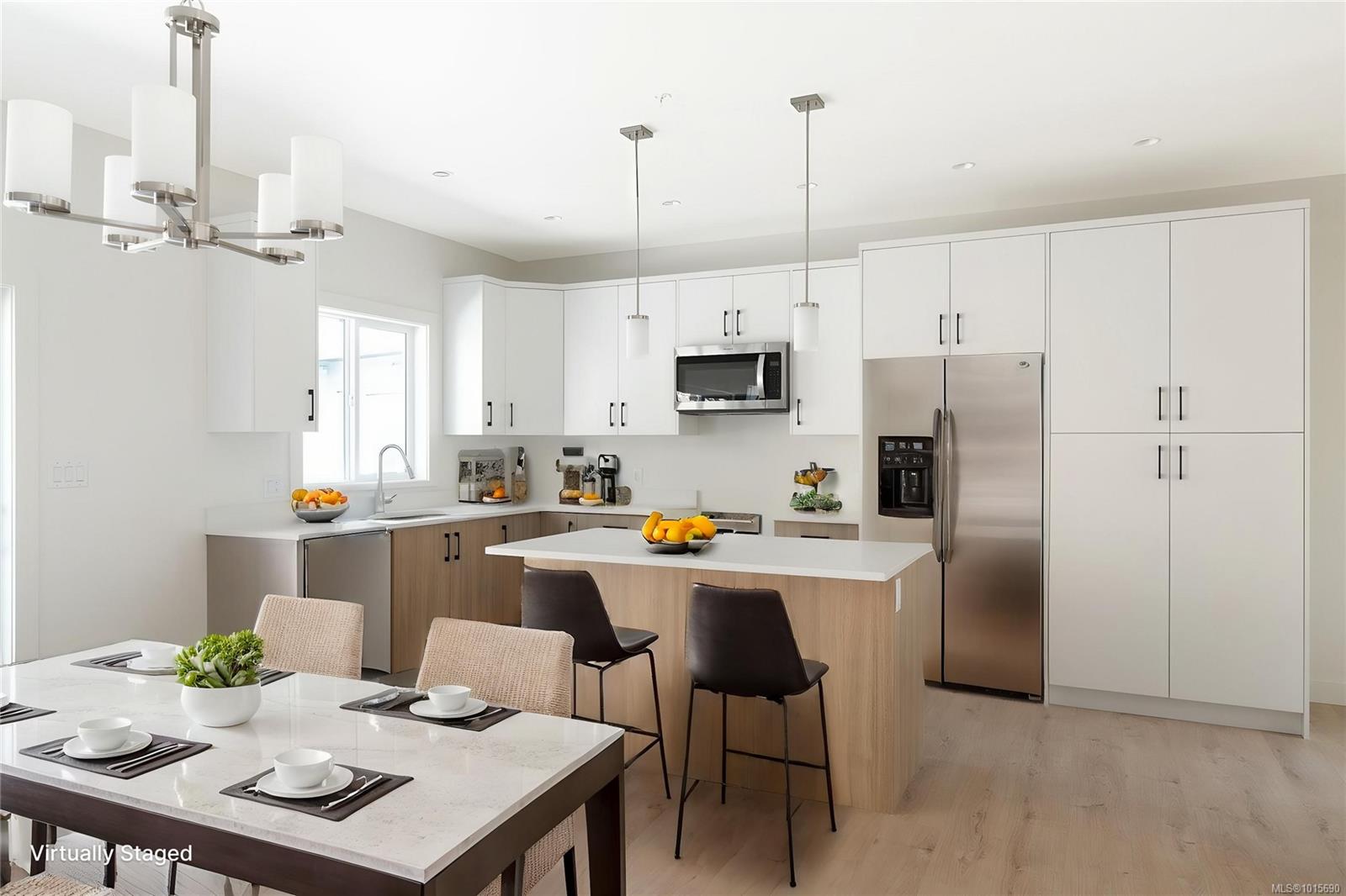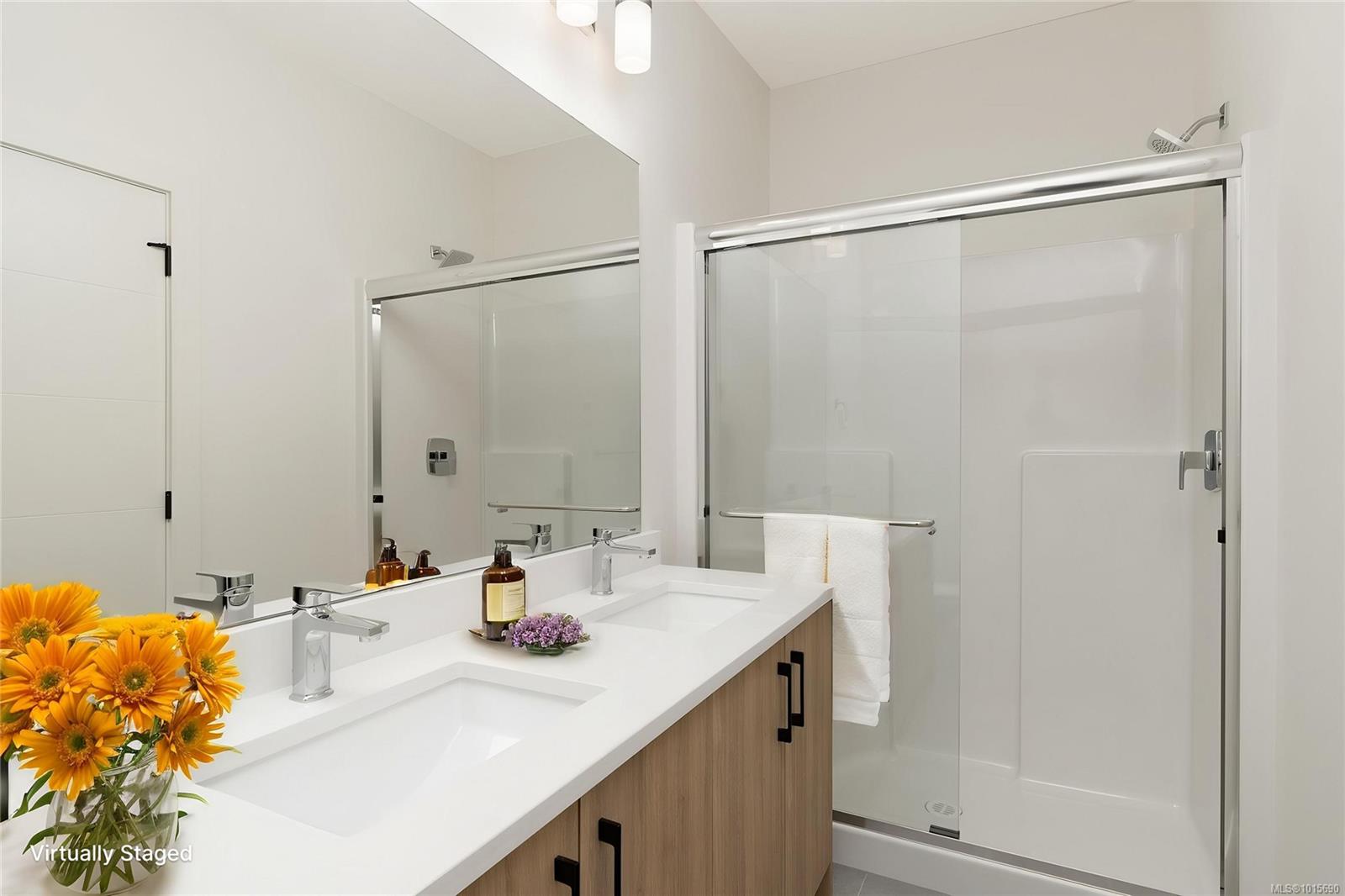 * MOST BUYERS SKIP THE PURCHASE TAX – SAVE OVER $15,000 * FIRST TIME BUYERS SKIP THE GST * Welcome to this beautiful 3-Bed end-unit townhome in sought-after West Park at Thetis Lake. Built by award-winning Limona Group, this home showcases craftsmanship and thoughtful design throughout. The open-concept upper level features a spacious kitchen with quartz counters and stainless appliances, a cozy gas fireplace, and a very private rear patio. The generous primary suite includes a walk-in closet and a luxurious ensuite with double sinks, heated floor, and oversized shower. Downstairs offers a media room, 2 more bedrooms, and a double garage pre-wired for your EV. Additional features include a heat pump, irrigated front yard, and full 10-year new home warranty. Live just steps from Thetis Lake Park for trails, swimming, and paddling. Two pets welcome. Move in ready. Price + GST. Interior photos of similar suite.