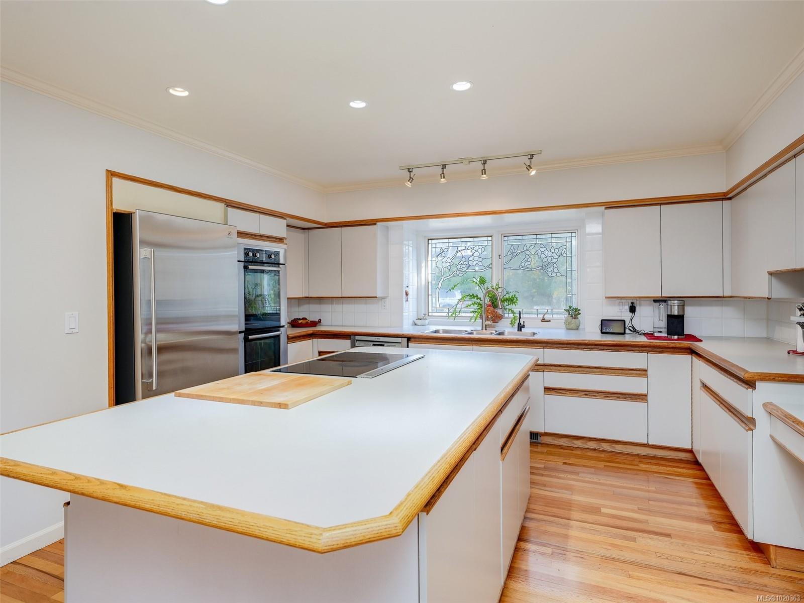 WEDGEWOOD POINT EXECUTIVE HOME IN TEN MILE POINT. This well appointed spacious 4 bedroom, 4 bathroom family home has exceptional features including stained glass entry, oak wainscoting and gleaming oak floors throughout the main living areas will appease the discerning buyer. Entertain in the over-sized living room with natural gas fireplace and separate dining room. Kitchen comes equipped with newer appliances, huge island, eating area and access to back deck for easy BBQ's. The laundry room, 3 baths, a den & 3 generously sized bedrooms, including the primary bedroom complete this level. Primary bed features an updated walk-in closet and spa-like 4pce ensuite. Upstairs you will find a family room with wet bar & could easily be a Nanny suite or host students, media/rec room, 4-piece bath and 4th bed. Upgrades include new gas furnace with AC heat pump, landscaping, metal fence, hot water tank, remote blinds & more! Walk to Cadboro Bay Village and local beaches, close to UVIC and walking trails.