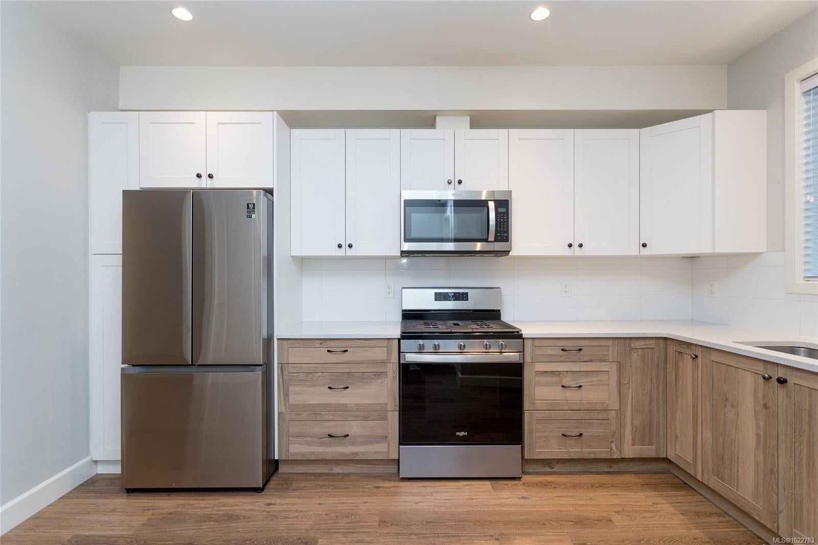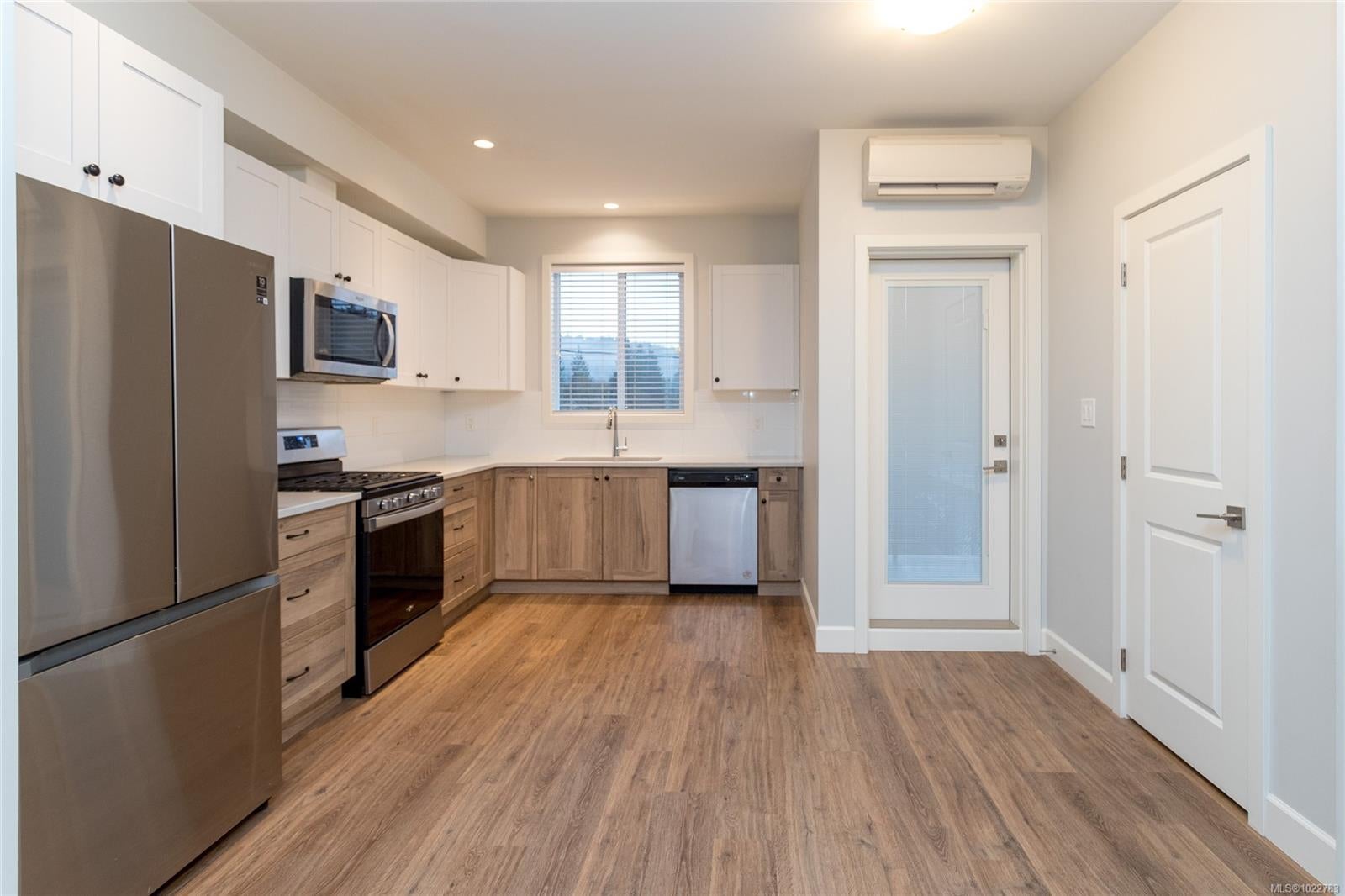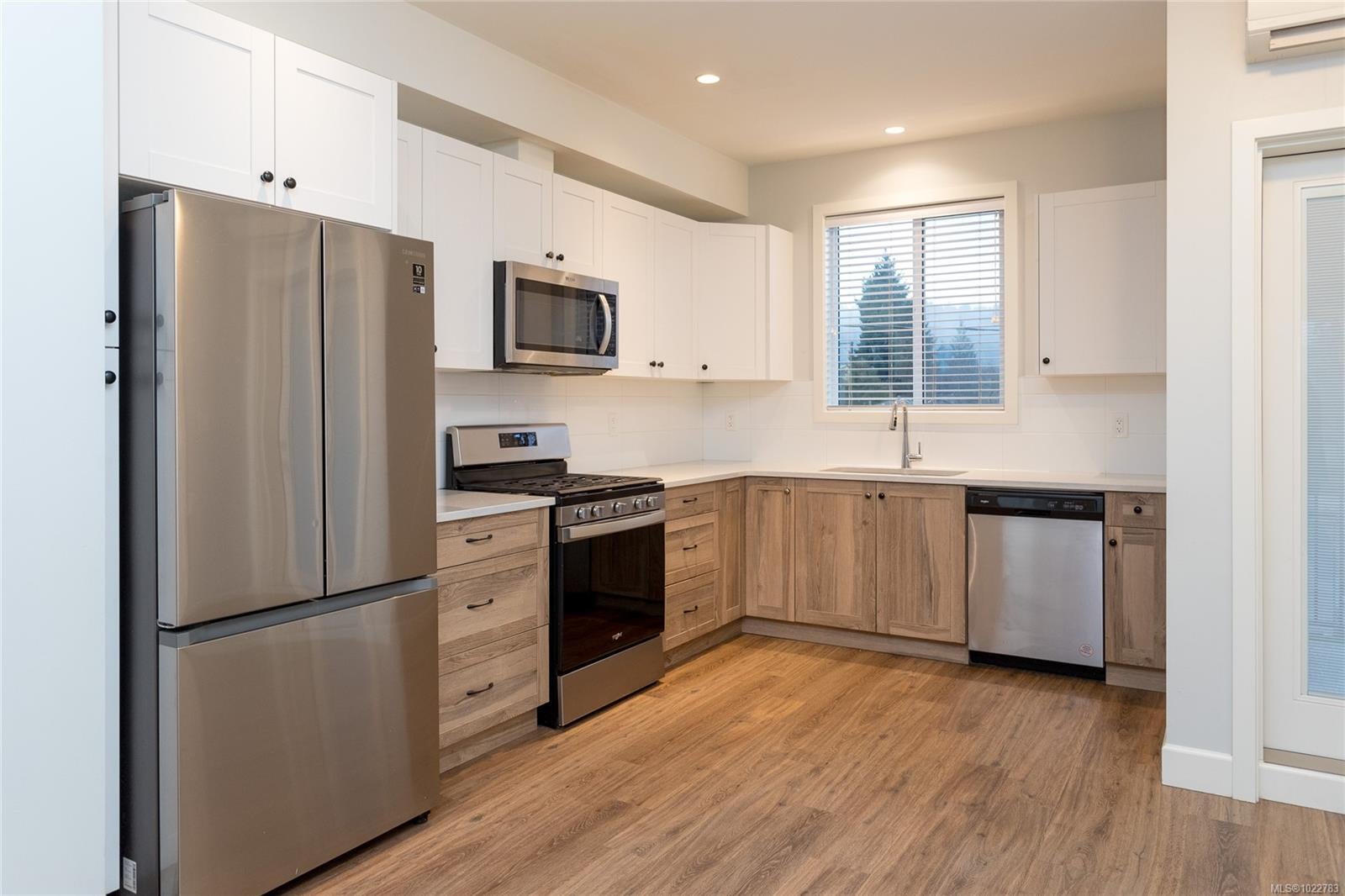 Beautifully designed 3-bedroom, 3-bathroom in the sought-after Luxton Flats community, built in 2021 & located in the heart of family-friendly Happy Valley. Offering over 1,300 sq. ft. of well-planned living space, this home blends modern design w everyday comfort. Open-concept main level features 9’ ceilings & stylish kitchen w quartz countertops, subway tile backsplash, stainless steel appliances + gas range, flowing seamlessly into the dining & living areas—ideal for both entertaining & daily living. Step outside to a quiet balcony w natural gas BBQ hookup, perfect for morning coffee or year-round enjoyment. Upstairs, the spacious primary bedroom offers a walk-in closet & ensuite, second large bedroom, dedicated office/third bedroom & a full bathroom. Other features include ductless heat pumps, gas hot water, tandem 2 car garage, ample storage & direct access to a fully fenced yard—perfect for kids or pets. Convenient location close to parks, schools & the Galloping Goose Trail.