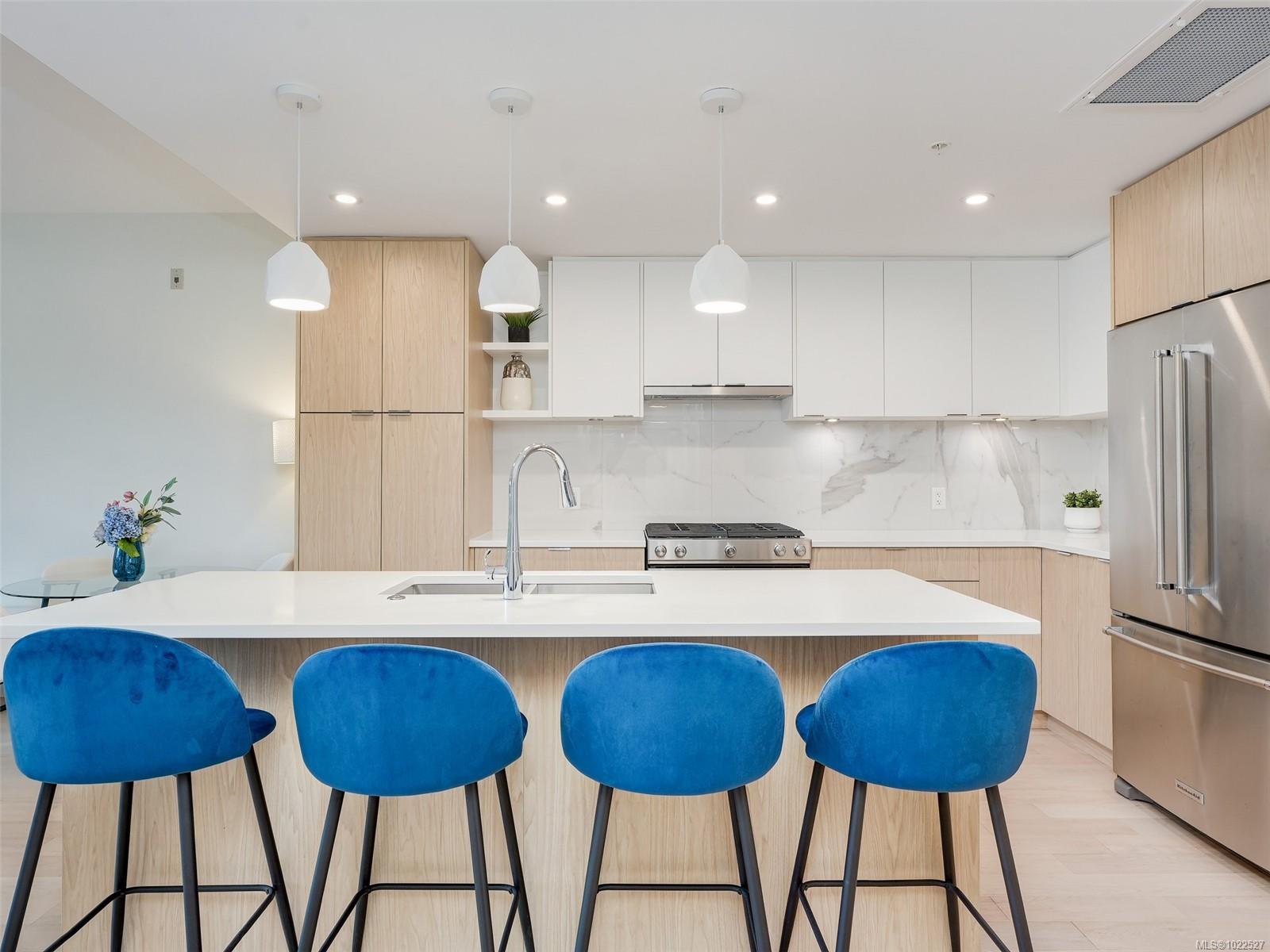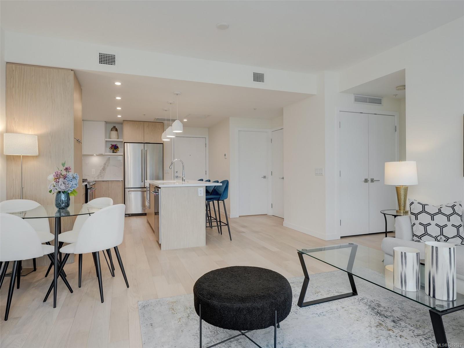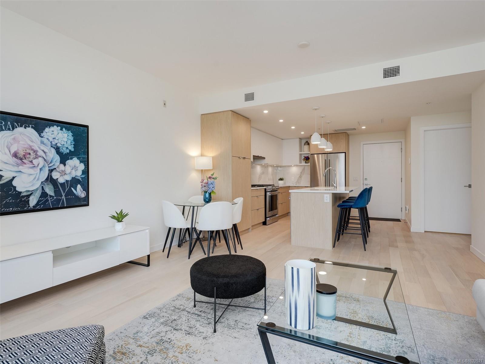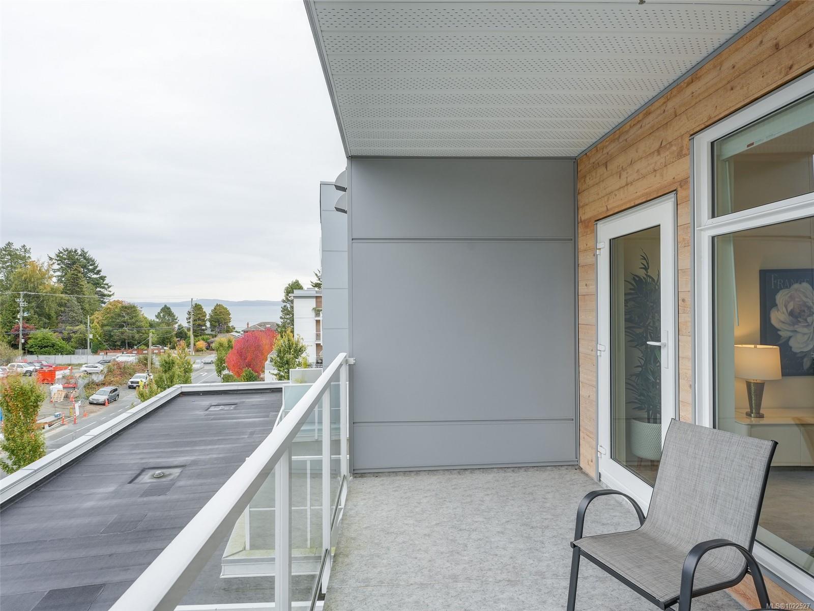 COASTAL LIVING AT THE PRESTIGIOUS HARO. Enjoy ocean views from your 1 bedroom, 2 bath condo that captures luxurious living in beautiful Cordova Bay. The interior showcases a chef-inspired kitchen with premium KitchenAid appliances, sleek quartz countertops, and ample pantry storage. Hardwood flooring guides you to the primary suite, which includes a walk-in closet, a spa-like 5-piece ensuite with a deep soaker tub, heated floors, and dual vanities. Gas outlet on the deck for your BBQ or fire pit. Added conveniences include in-suite laundry, secure underground parking, separate storage locker, bike storage all in a pet friendly complex. Situated on the quiet side of the building ensures a peaceful atmosphere. Short stroll to the ocean, close to restaurants, gym, shopping, Mattick's farm and an easy commute to downtown, ferries and the airport.