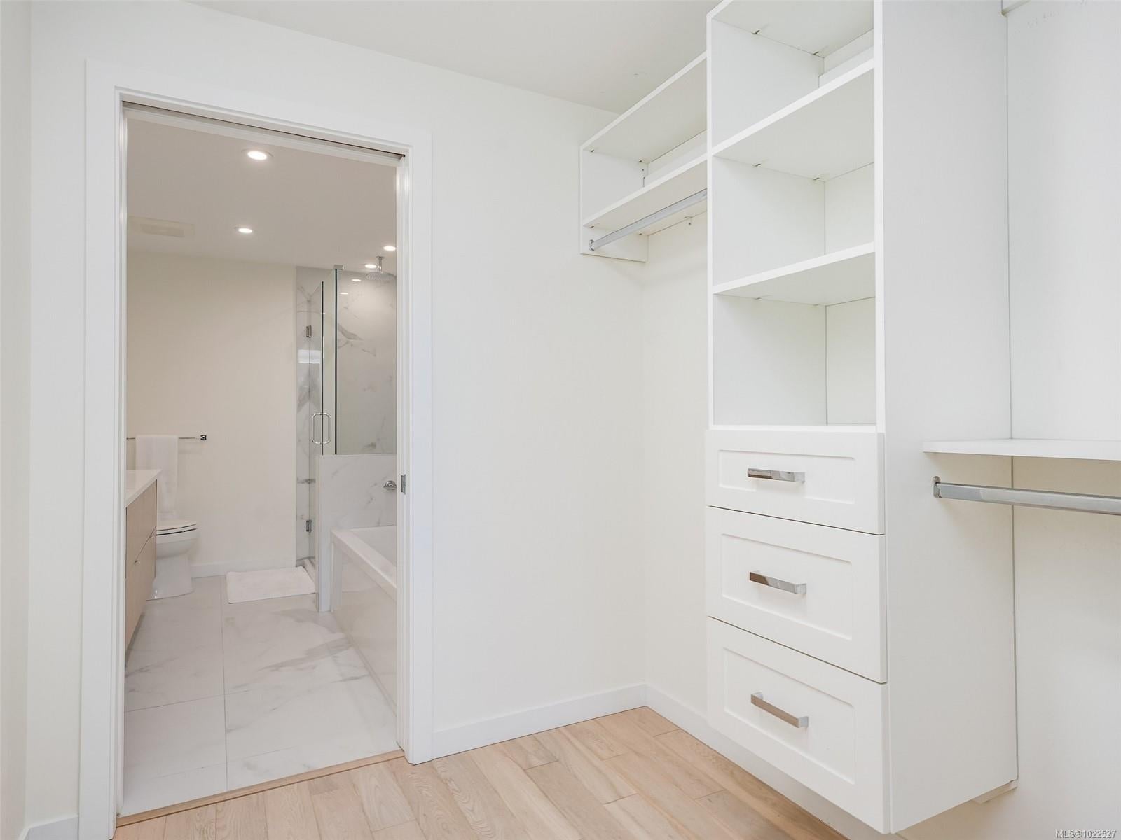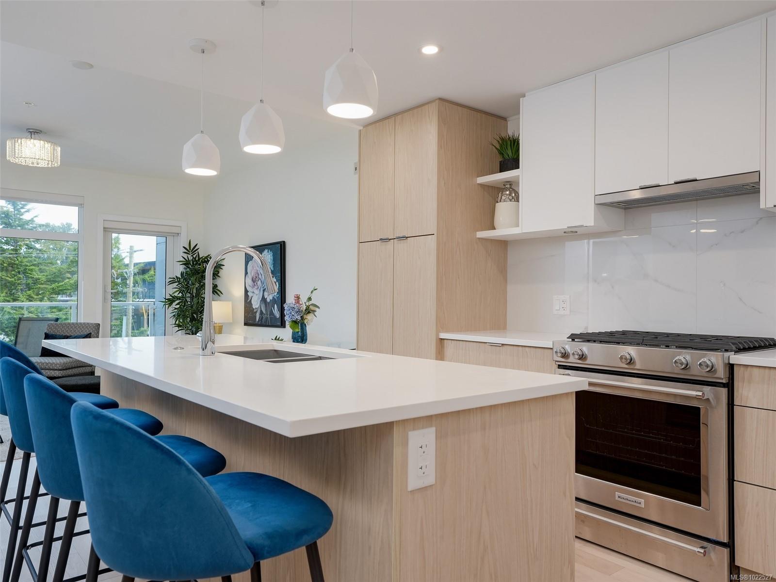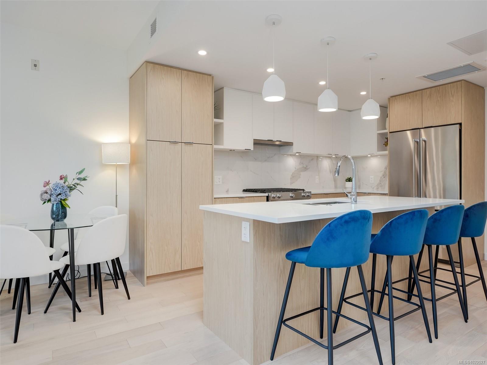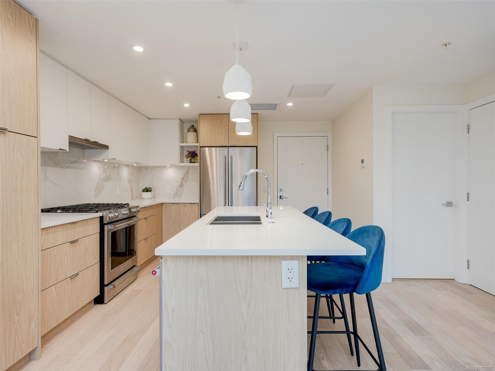 COASTAL LIVING AT THE PRESTIGIOUS HARO. Enjoy ocean views from your 1 bedroom, 2 bath condo that captures luxurious living in beautiful Cordova Bay. The interior showcases a chef-inspired kitchen with premium KitchenAid appliances, sleek quartz countertops, and ample pantry storage. Hardwood flooring guides you to the primary suite, which includes a walk-in closet, a spa-like 5-piece ensuite with a deep soaker tub, heated floors, and dual vanities. Gas outlet on the deck for your BBQ or fire pit. Added conveniences include in-suite laundry, secure underground parking, separate storage locker, bike storage all in a pet friendly complex. Situated on the quiet side of the building ensures a peaceful atmosphere. Short stroll to the ocean, close to restaurants, gym, shopping, Mattick's farm and an easy commute to downtown, ferries and the airport.