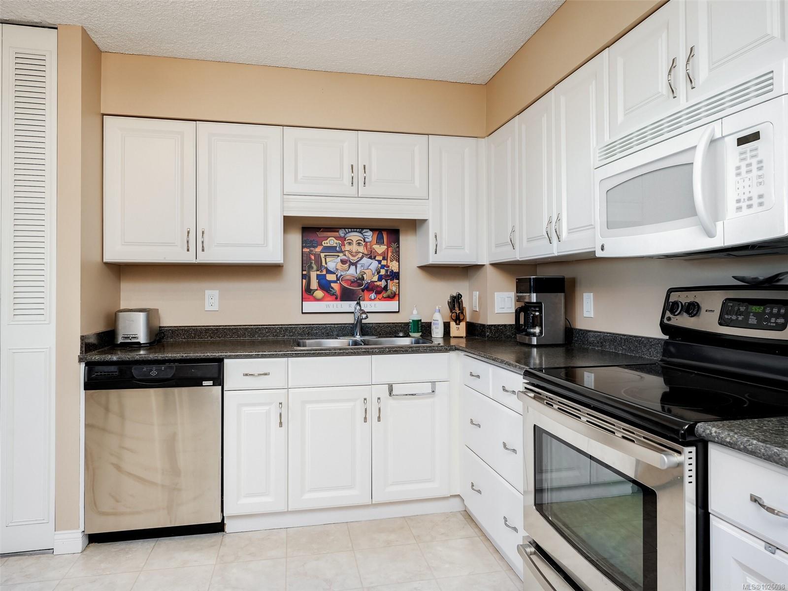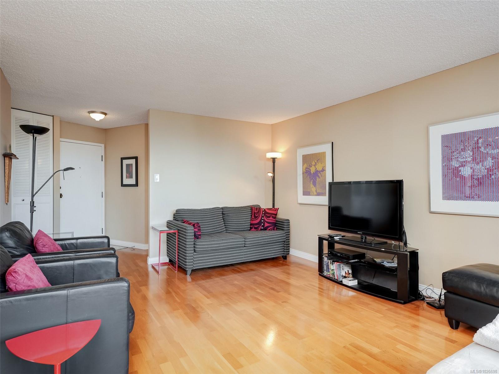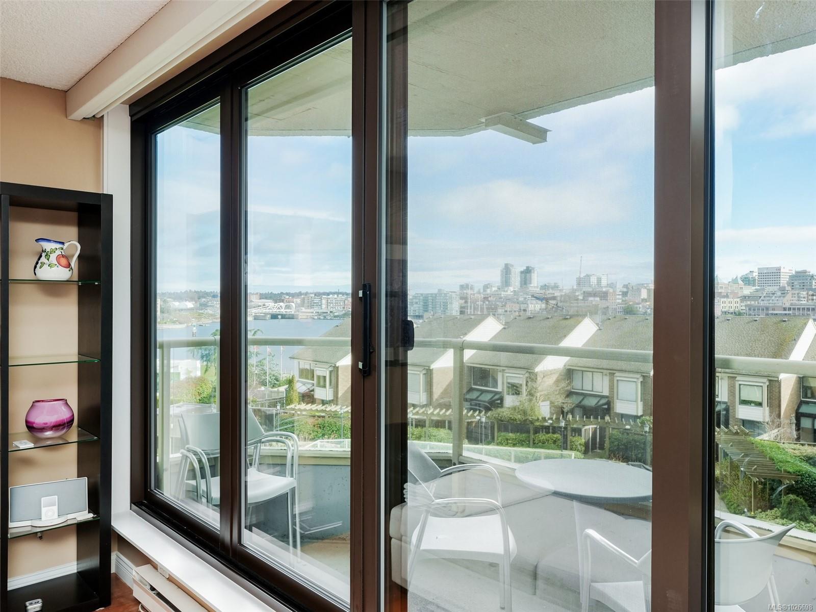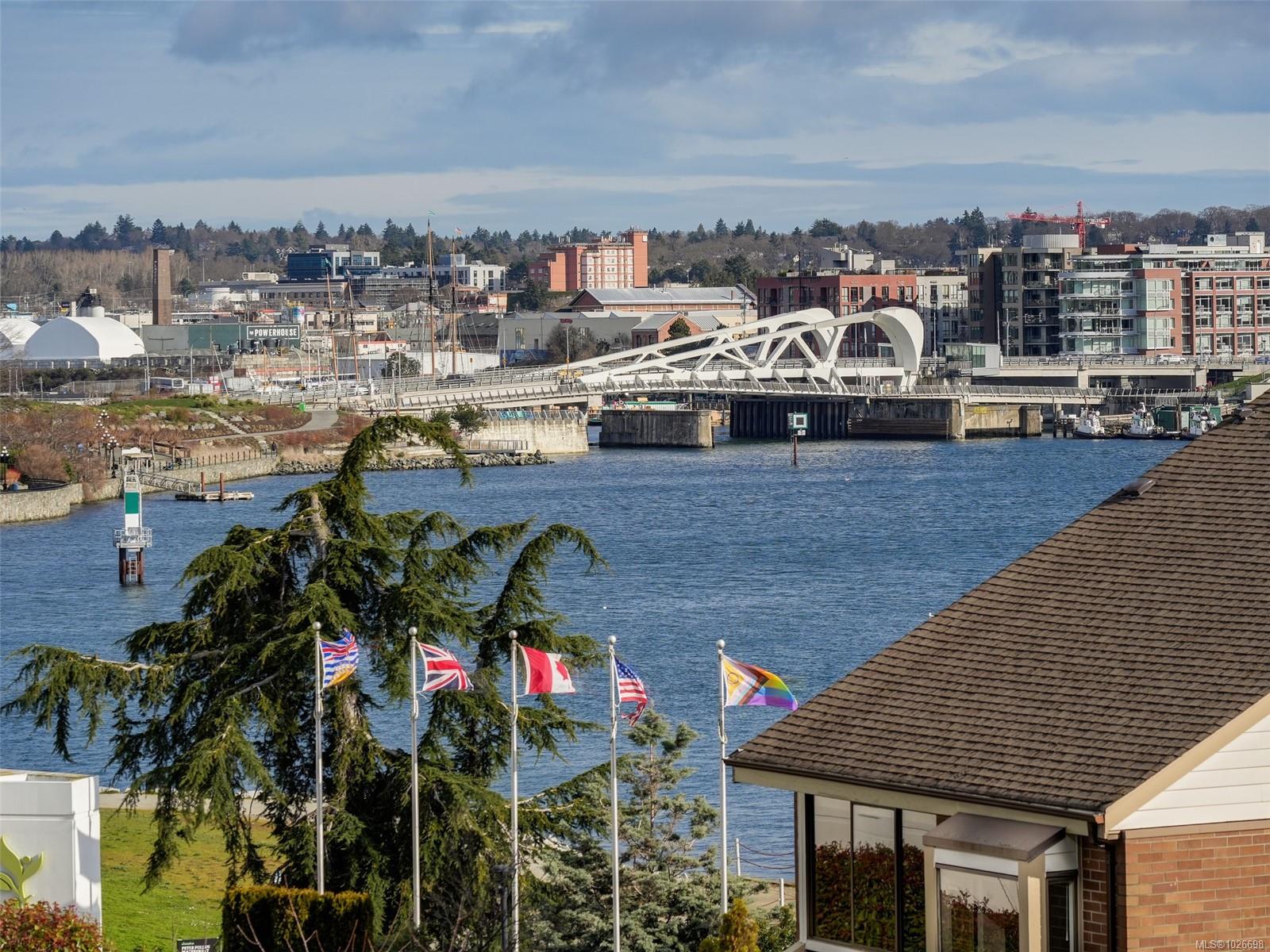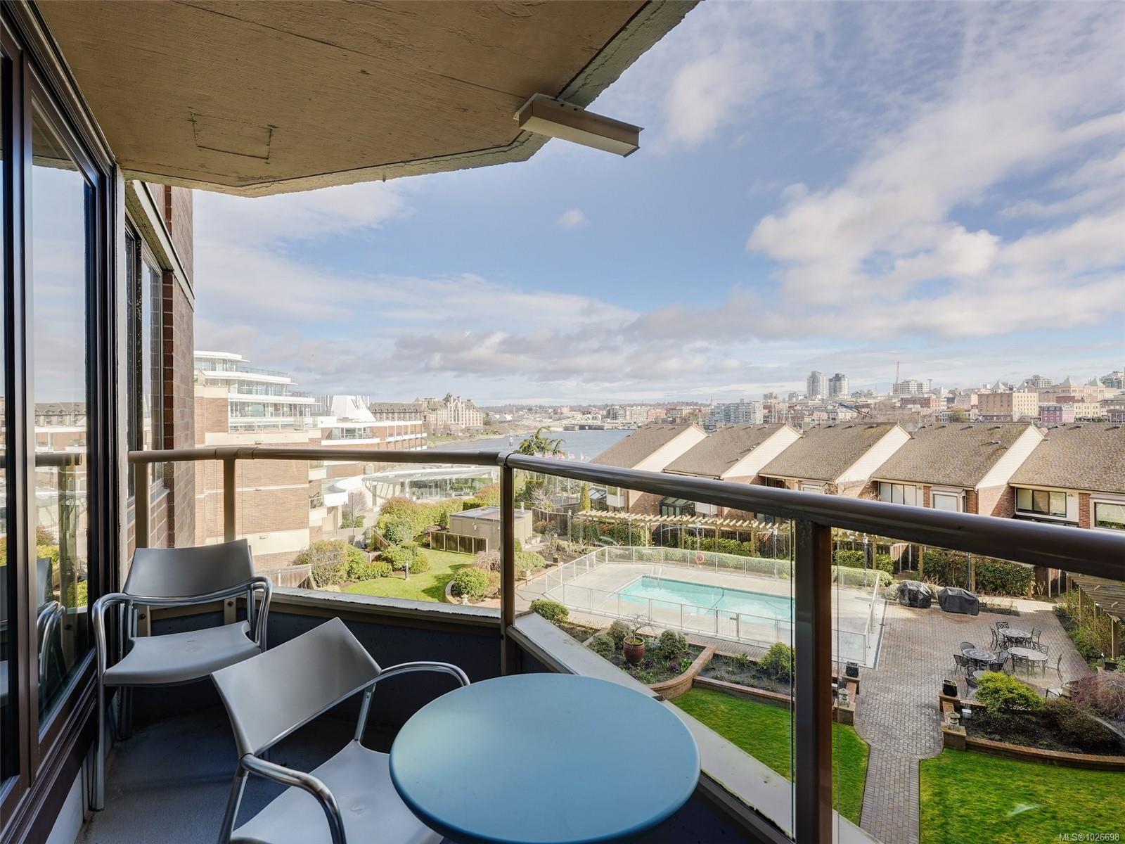 LAUREL POINT CONDO WITH OCEAN VIEWS. A highly coveted luxury condo complex in the heart of James Bay. Two bedrooms and two bathrooms offering a spacious living space with beautiful engineered hardwood flooring. The kitchen has newer appliances and bar seating, separate dining area and a living room with access to your covered balcony with a view of the pool and the harbour. The primary bedroom features a walk-in closet and a 4 piece ensuite. This building has much to offer with an outdoor pool, courtyard with BBQ and outdoor seating, games/amenities room, library, workshop and sauna. Comes with a secured underground parking, separate storage in a pet friendly building. Easy access to the David Foster Walkway and stroll along the waterfront. Fisherman's Wharf, parks, cafes, restaurants and shopping all within close proximity. Live where you love, book your showing today.
