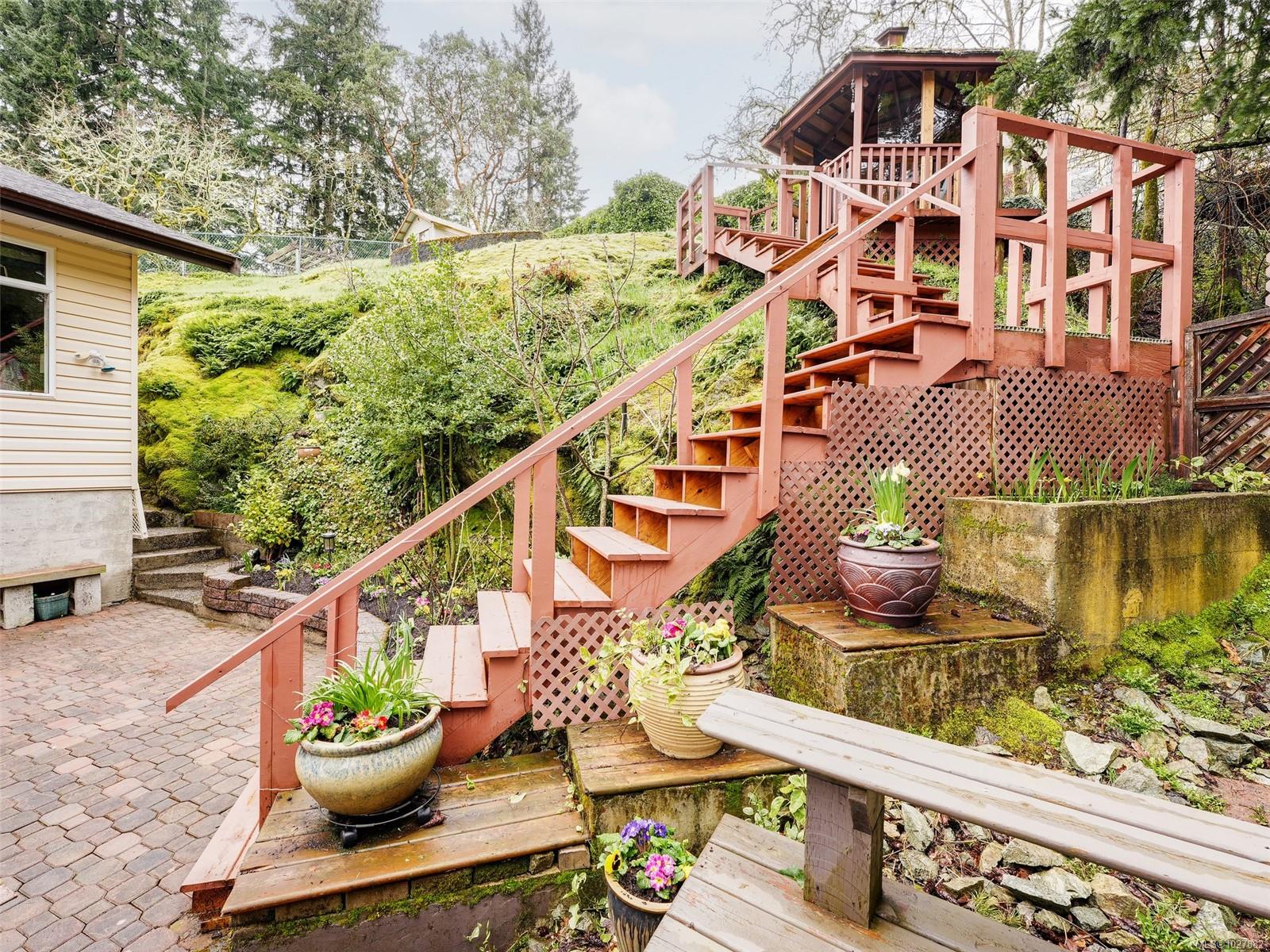 SPACIOUS BRENTWOOD BAY FAMILY HOME. Situated in a quiet neighbourhood this 3 bed, 3 bath home awaits its new owners. This lovely home with AC/heat pump captures timeless features with hardwood floors and beautiful mill work. Enter through the lower area which offers a second primary bedroom (no closet) with 4 piece ensuite and heated floors or use as an office/den/ recreation room. The walk-in crawlspace has plenty of storage. The main level features a formal living room with a natural gas fireplace and separate dining area. The kitchen has a cozy eating area with access to the front deck, few steps up to the main primary bedroom with walk-in closet and 3 pieces ensuite, 2nd bedroom, 4 piece main bath and laundry. The family room leads to the back yard which offers several different seating areas and a staircase to take you to the top of the property to enjoy the views. Wander through the rock pathway and enjoy the thoughtfully landscaped garden beds and tiered yard. The oversized double garage will have the hobbyists right in their element. Located close to Gore & Amwell Park, Butchart Gardens & Anglers Anchorage Marina.